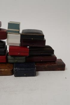 A group of twenty four vintage jewellery cases, including two earring cases, five medallion/pocket watch cases; two cocktail watch cases; four brooch cases; two ring cases; a double bangle case; two cufflink cases; and six plain cases, one by Garrard