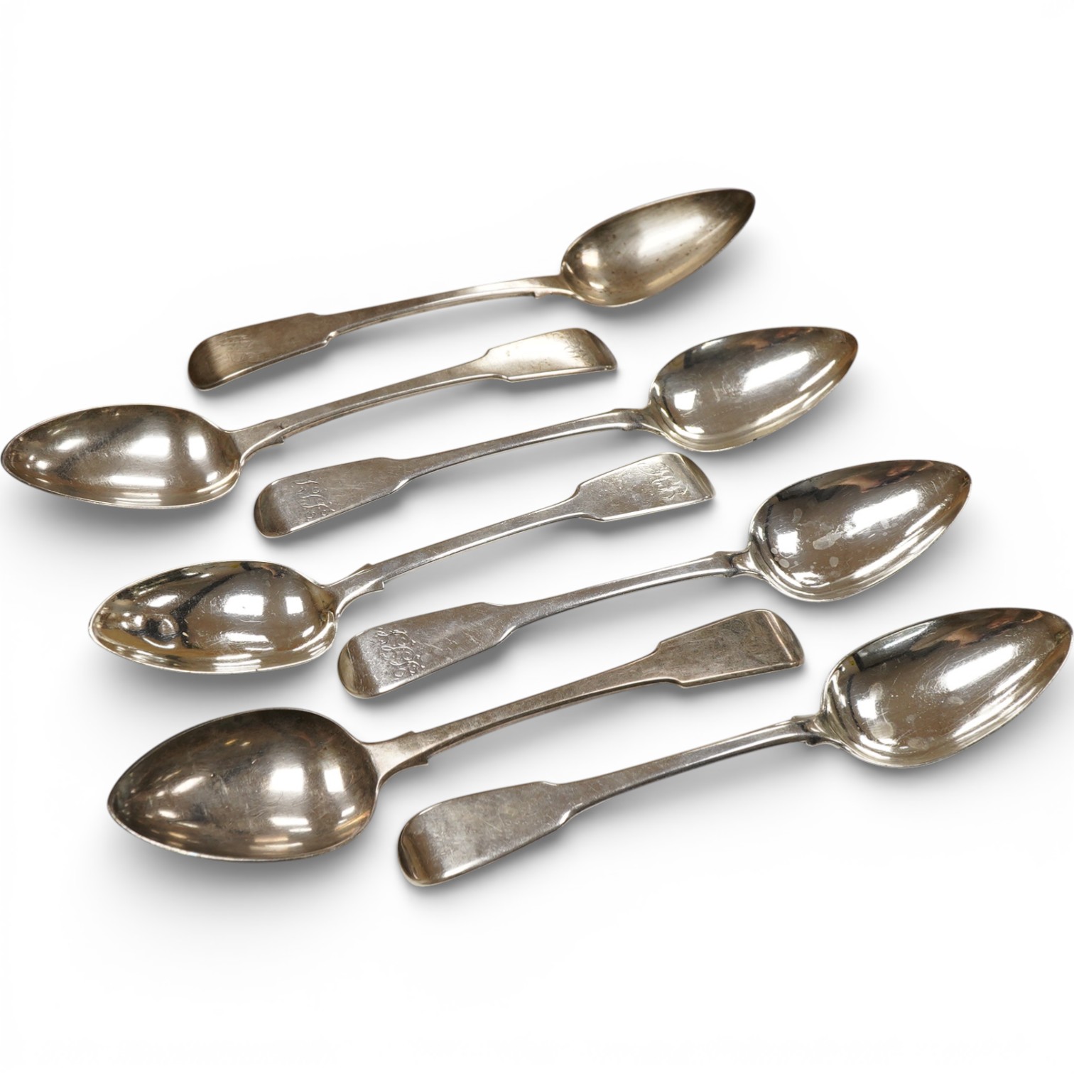 Lot 833 , A harlequin set of seven George III and later silver fiddle pattern table spoons, various dates and makers, 16.7oz.