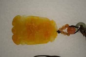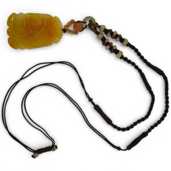 Lot 1161 , A jadeite pendant, China, 20th century, suspending a foliate yellow jadeite plaque pendant designed as an animal beneath a fruiting tree, to an adjustable cord necklace threaded with varicoloured jadeite beads and hoops,