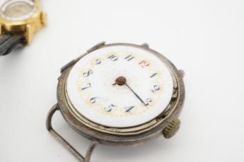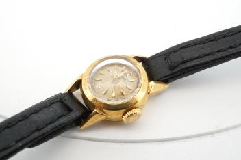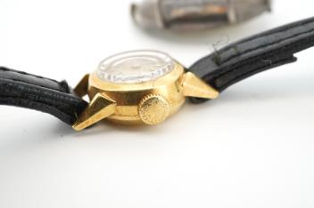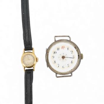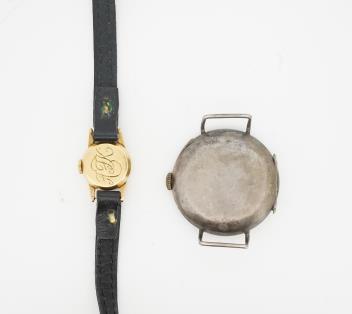 Lot 1919 , A lady's 18k Longines manual wind wrist watch, with baton and Arabic numerals, the case back with engraved initials, on an associated leather strap, together with a 935 standard white metal wrist watch(a.f.).