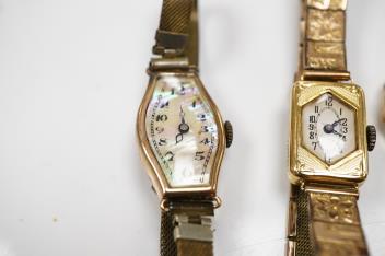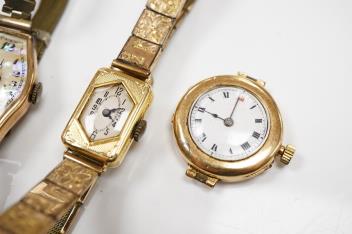 A lady's 1920's 18ct gold manual wind wrist watch, on a gold plated strap, together with a lady's 15ct gold manual wind wrist watch, no strap, a lady's 9ct gold manual wind wrist.
