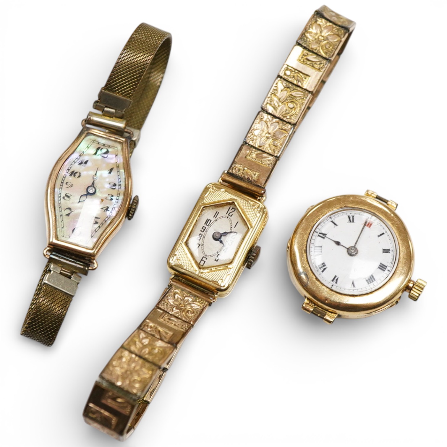 Lot 1902 , A lady's 1920's 18ct gold manual wind wrist watch, on a gold plated strap, together with a lady's 15ct gold manual wind wrist watch, no strap, a lady's 9ct gold manual wind wrist.