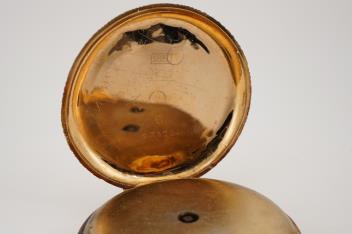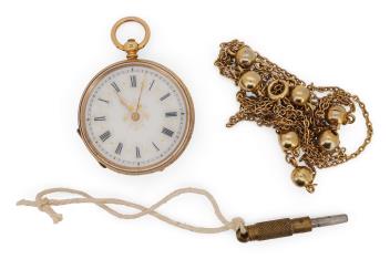 Gilt metal cuvette. Dial and glass in good order. Case in good order. Watch ticks when wound. Part of the gilt metal chain has become detached(damaged). Comes with a loose watch spring.