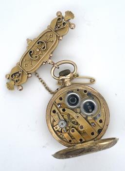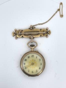 A lady's gold and Swiss enamel fob watch, circa 1907, the cream dial with gold enamel decoration and Arabic numeral indicators, the case with scrolled decoration, the reverse depicting a woman and lamb in a pastoral scene in painted enamels, mounted in 15ct gold, interior with British import hallmarks for Chester, date letter for 1907, suspended from a Victorian 15ct gold panel brooch, British hallmarks, date letter for 1887, total length 5.6cm, combined gross weight approximately 20 grams including safety chain