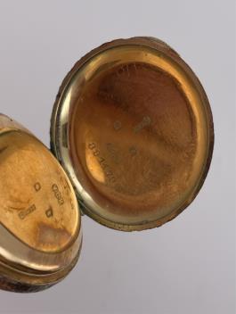 Lot 1947 , A lady's gold and Swiss enamel fob watch, circa 1907, the cream dial with gold enamel decoration and Arabic numeral indicators, the case with scrolled decoration, the reverse depicting a woman and lamb in a pastoral scen