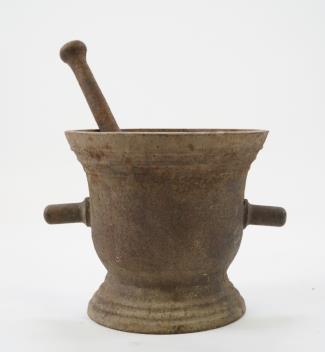 A large 18th/19thc cast iron mortar and pestle, the mortar 29.5cm high