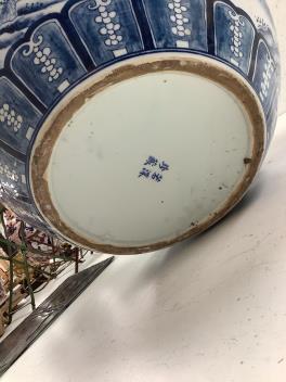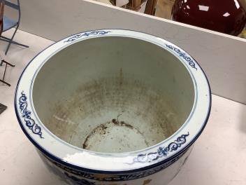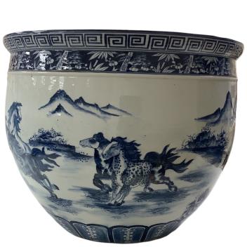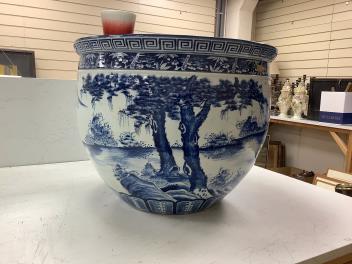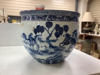 Lot 1208 , A large Chinese blue and white jardiniere decorated with horses in a landscape, 54cm in diameter