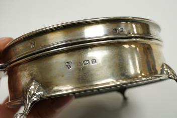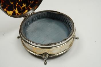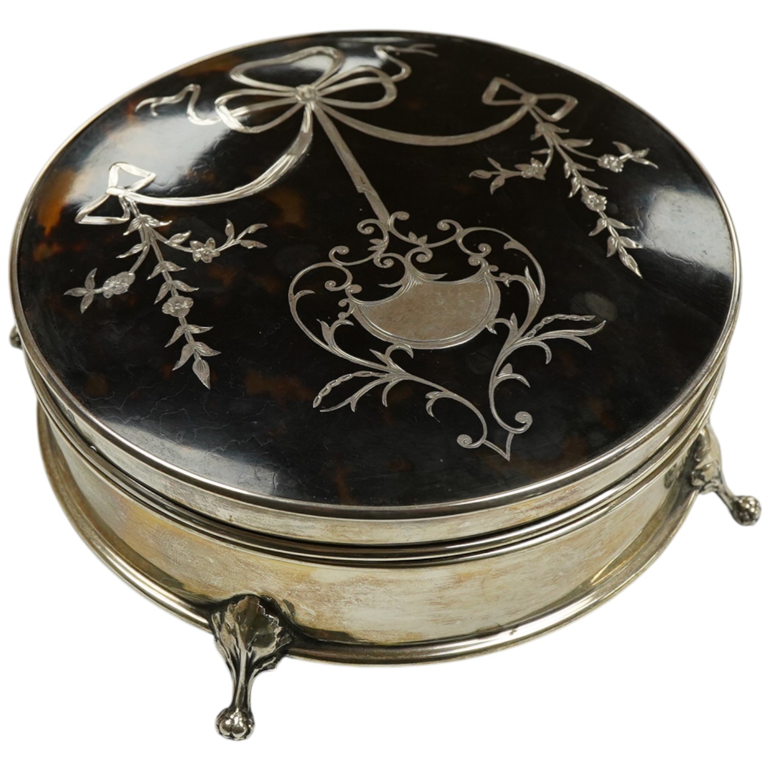 Lot 869 , A large George V silver and tortoiseshell pique mounted circular trinket box, on four paw feet, Charles Boyton & Son Ltd, Birmingham, 1912, diameter 13cm.
