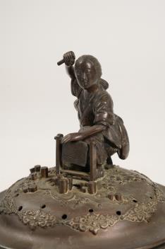 A large Japanese bronze koro and cover, 19th century, crisply cast in relief with chrysanthemums, birds and flowers on a archaistic scroll work ground, zoomophic handles and four feet, the domed cover surmounted by the figure of man brushing his hair, cast five character mark to base, 30cm high, small faults
