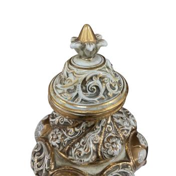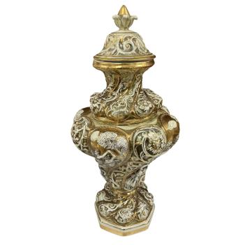 A large Lladro porcelain figure of a seated lady holding a fan, 35cm high, together with an Italian gilt pottery vase and cover