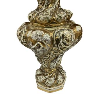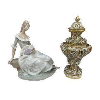 Lot 1499 , A large Lladro porcelain figure of a seated lady holding a fan, 35cm high, together with an Italian gilt pottery vase and cover