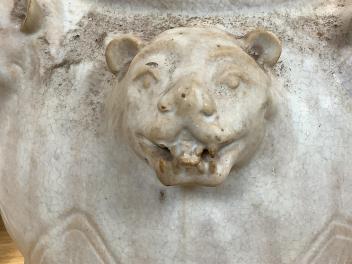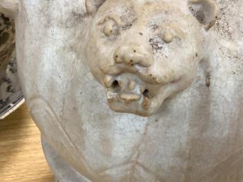 Three out of six of the lion masks with a chipped and missing tooth, images 5-7; otherwise structurally good; crazed throughout.