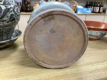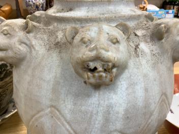 Lot 423 , A large Thai pale blue glazed jar decorated with panther masks, 47cm