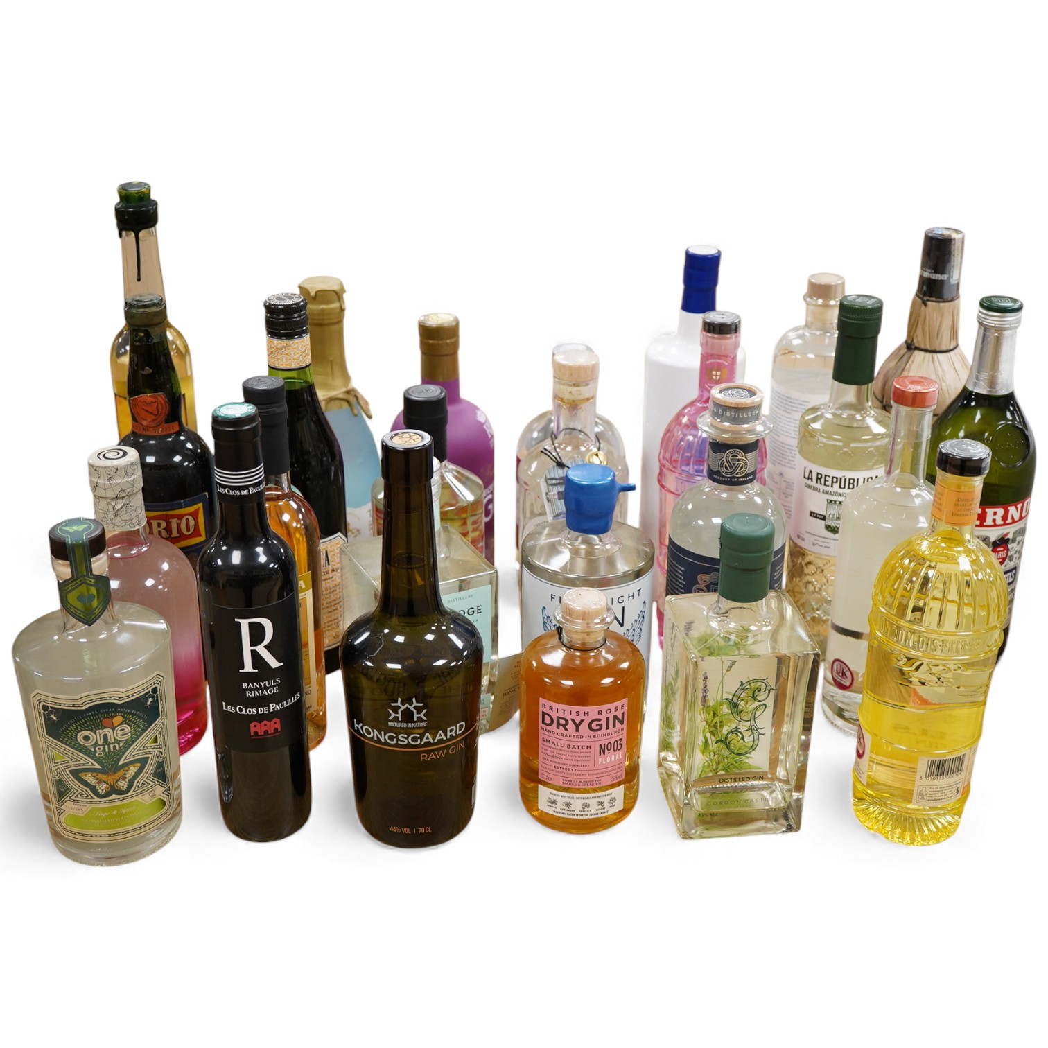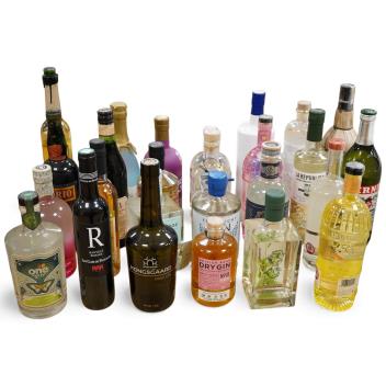 A large collection of various spirits and liqueurs, mostly gin, twenty six bottles