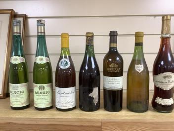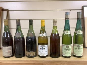 A large group of mixed white wines including two bottles Chablis Les Clos Grand Cru 1966, five bottles Château Chalon 1961, two others 1974, 1976, Louis Latour Montagny 1er Cru 1997, Montrachet 1978, various Chardonnay, Acacio Vinho Verde, Clavoillin Puligny-Montrachet 1990, unlabelled bottles etc. (39)