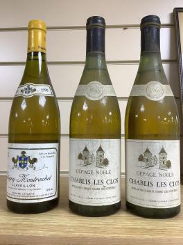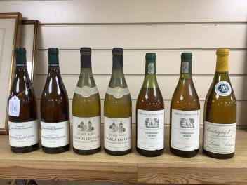 Lot 341 , A large group of mixed white wines including two bottles Chablis Les Clos Grand Cru 1966, five bottles Château Chalon 1961, two others 1974, 1976, Louis Latour Montagny 1er Cru 1997, Montrachet 1978, various Chardonnay,