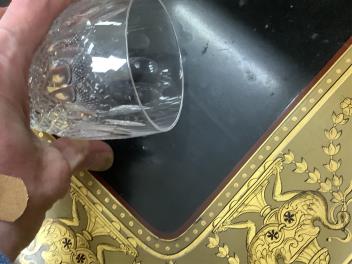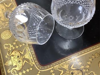 Six brandy glassses - two with tiny chips at inside edge of neckrim; another with large chips to neckrim; one with large chip to footrim; two good. Ten tumblers - one neckrim chipped, others good. Six 13cm wines - one with tiny nick to footrim; others good. Eight 19cm glasses - all good. Nine 15cm glasses - all good. Seven dessert glasses with wide bowls - all good. Some factory marks very feint. 46 total, not 45.