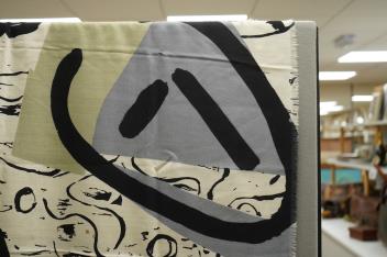 Lot 320 , A large wool scarf designed with large faces by Brian Bolger, (RCA 1983) and The Cloth.100cm wide x 140cm. Condition - good