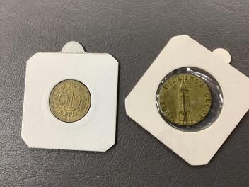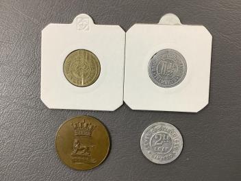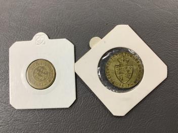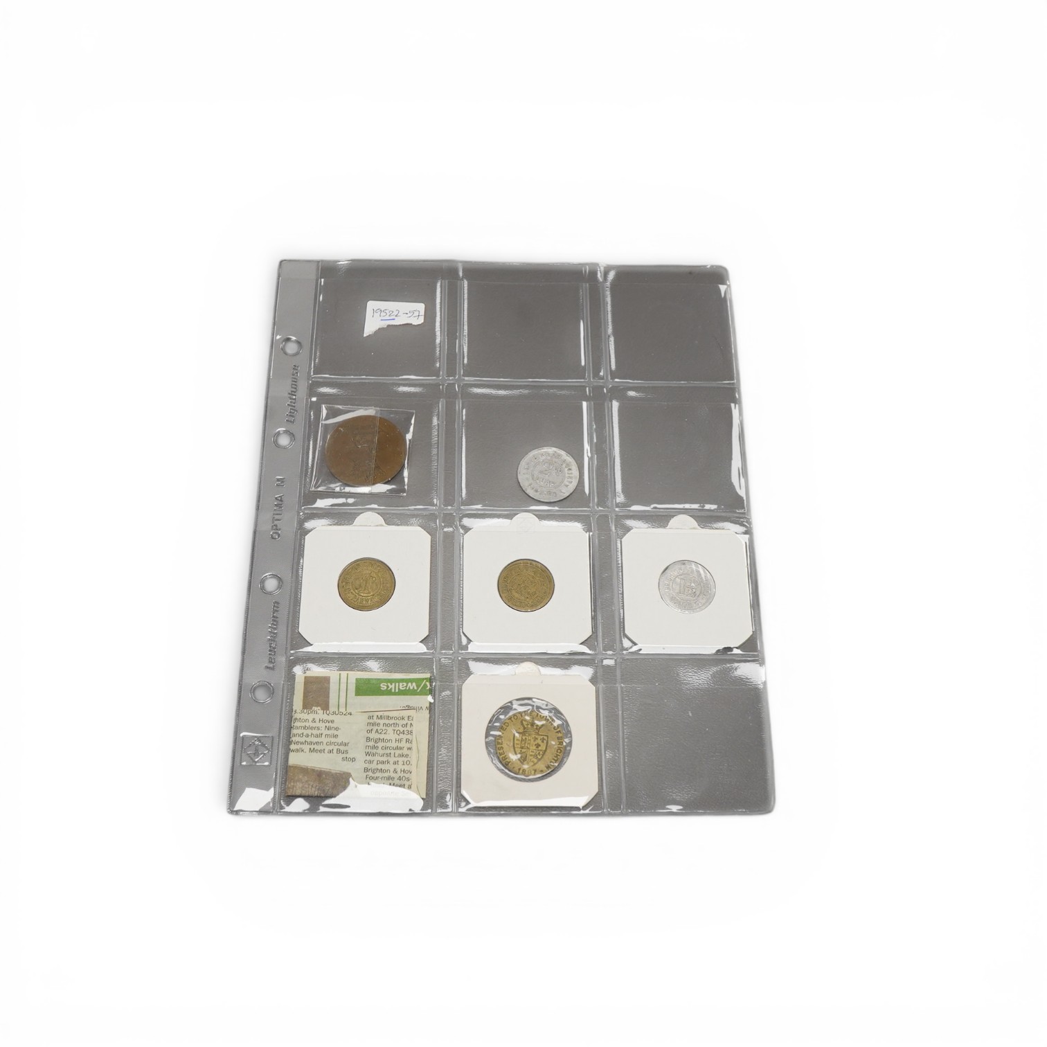 A late 18th/early 19th century Shoreham toll bridge pass showing the arms of the Earl of Surrey, blank on the reverse, together with three Brighton Corporation Tramways post office staff tokens; two 1d and a 1 1/2d, a Lewes Co-op Society 2lb loaf token, and an 1887 Willing’s Clock Tower commemorative medal