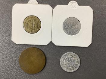 Lot 153 , A late 18th/early 19th century Shoreham toll bridge pass showing the arms of the Earl of Surrey, blank on the reverse, together with three Brighton Corporation Tramways post office staff tokens; two 1d and a 1 1/2d, a Le
