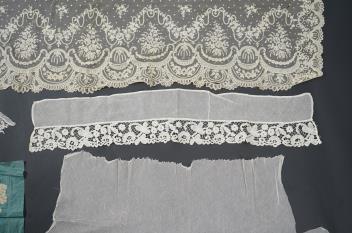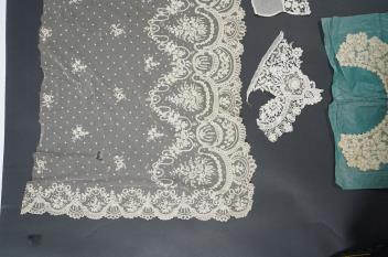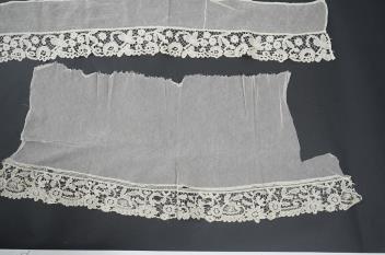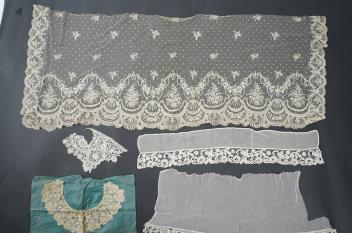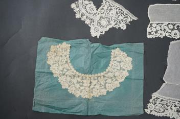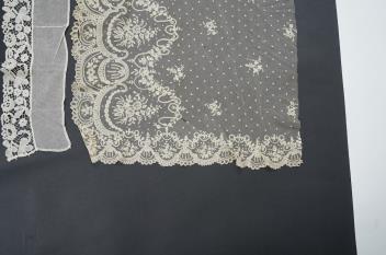 Lot 344 , A late 19th century Brussels bobbin lace on net section of a wedding veil, Brussels bobbin lace collar, a point de gaz lace motif and two lengths of later bobbin lace trimming possibly Honiton with needle lace insertions