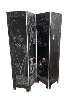 Lot 95 , A late 19th century Chinese black lacquer four fold draught screen, each panel width 41cm, height 183cm