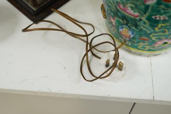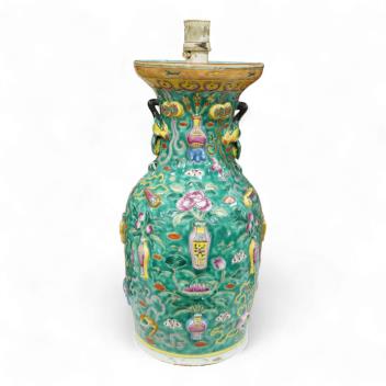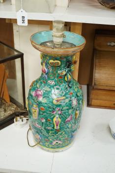 Lot 1272 , A late 19th century Chinese enamelled porcelain green ground vase with relief decoration, mounted as a lamp, 48cm high overall