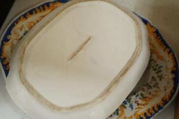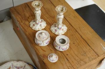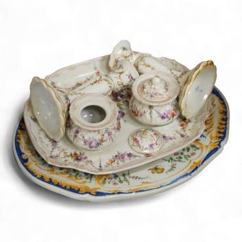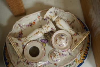 Lot 1549 , A late 19th century Dresden ink stand and a pair of candlesticks and a Nove faience dish