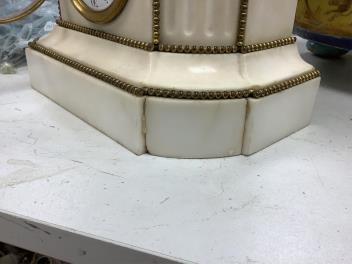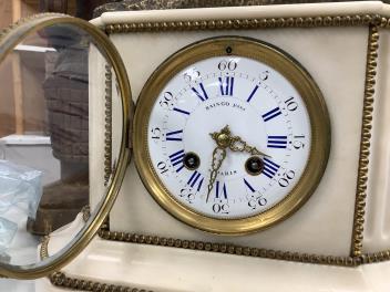 Case one angled marble plinth section glue re-attached, 7th image; otherwise case good including figure surmount and dial; Raingo Freres movement with outside countwheel. With key and pendulum, the movement has been set-going over some 30 hours and has lost 1/2minutes - although timekeeping not guaranteed.