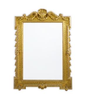A late 19th century French carved gilt wood and composition overmantel mirror with swagged scallop shell and scroll pediment over a rectangular bevelled plate within a roundel and fruiting leaf border. 110cm wide, 156cm high
