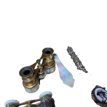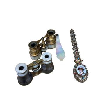 Lot 372 , A late 19th century French enamelled gilt metal parasol handle inset oval porcelain portrait plaque, length 19cm, and two pairs of Victorian opera glasses.