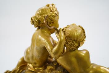 A late 19th century French gilt bronze figural mantel clock, with enamel dial, Roman hour numerals and Arabic minutes, signed to the dial Raingo Fres., a Paris, in a substantial gilt bronze case surmounted by two cherubs, emblematic of Spring, with ebonised wood base (dome missing), two train movement with anchor escapement, striking on a bell (bell missing), 48cm high, 61cm wide
