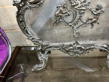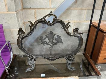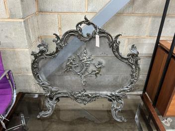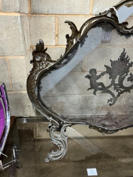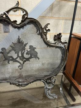 Lot 1018 , A late 19th century French rococo style cast brass mesh fire screen, width 72cm, height 70cm.