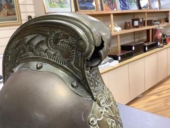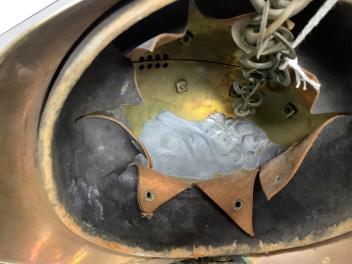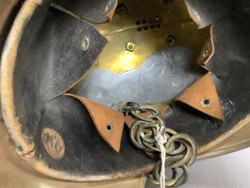 Comb clearly damaged at front, image 10; neckguard split, image 11; brass chin-strap now in two sections; minor dent to peak; evidence of solder repairs inside skull. A Merryweather fireman’s helmet - not for theatrical use.
