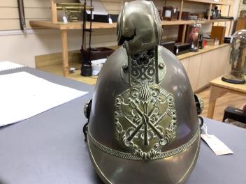 Lot 411 , A late 19th century Merryweather & Sons brass fireman’s helmet, early standard issue, 21cm high