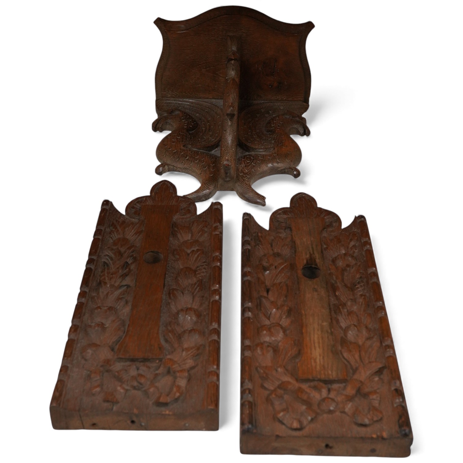 A late 19th century carved oak griffin wall bracket and a pair of carved oak wall light backplates, latter 41cm high