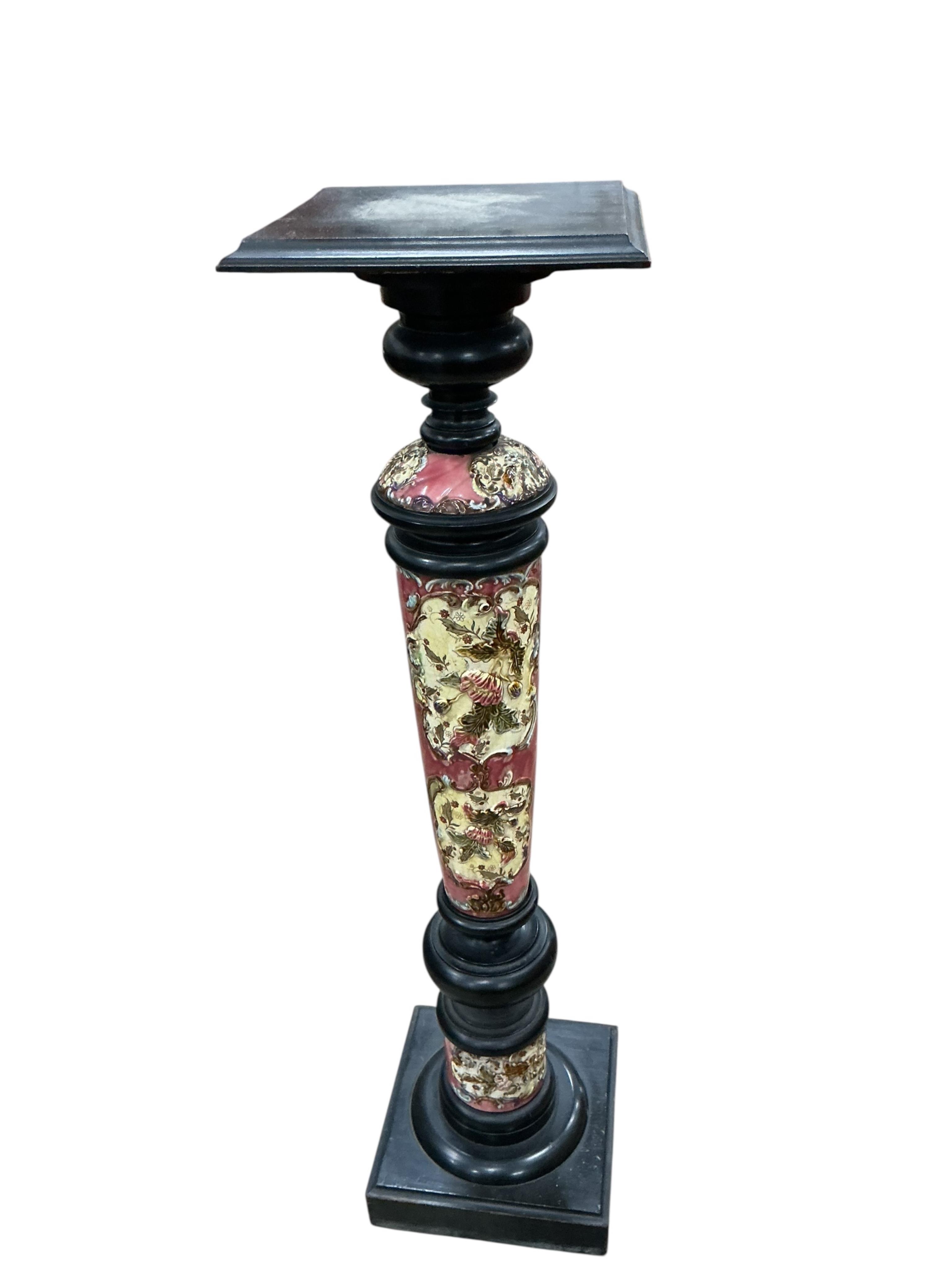 Lot 1009 , A late 19th century ebonised and pottery jardiniere stand, width 28cm, depth 29cm, height 113cm