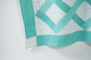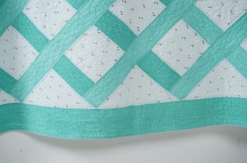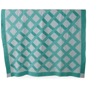 Lot 353 , A late 19th early 20th century English, Durham, immaculately hand quilted bedcover. Designed using a plain mint green cotton and a complimentary light floral cotton stripe, in an all over lattice design, with a mint gree