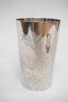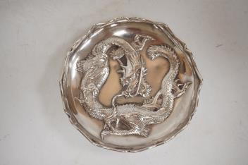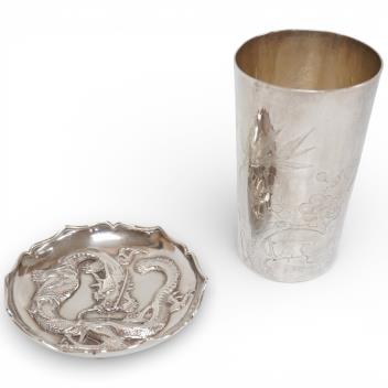 Lot 1013 , A late 19th/early 20th century Chinese white metal small dish, by Luen Wo, with applied dragon decoration, diameter 91mm, together with a Chinese white metal beaker, engraved with bamboo, height 10.4cm.