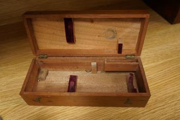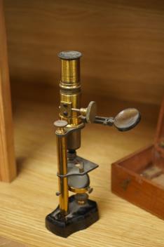 Lot 294 , A late 19th/early 20th century French brass compound monocular microscope, height 20.5cms, together with a teak case; 23cm wide, 9cm deep, 7cm high