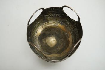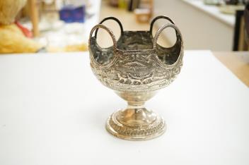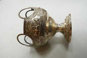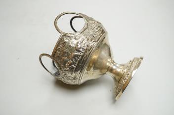 Lot 1850 , A late 19th/early 20th century Indian white metal pedestal bowl, with unusual ring handle border, embossed with continuous scene of wild animals, diameter 12.3cm, 6.3oz.