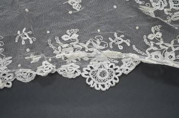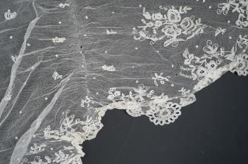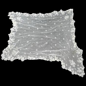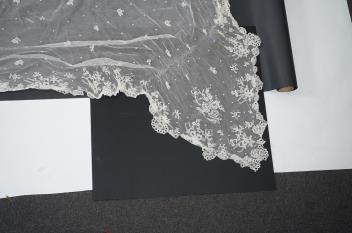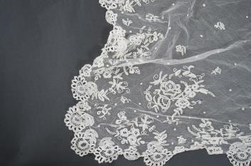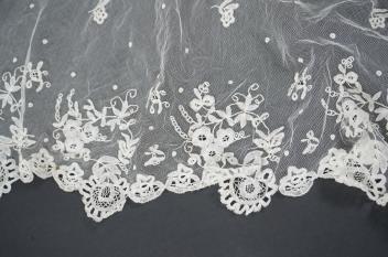 Lot 259 , A late Edwardian hand bobbin lace Honiton and net wedding veil, approximately 248cm x 230cm. Condition - one corner has corner has been attached to a hair comb and damaged the netting.