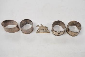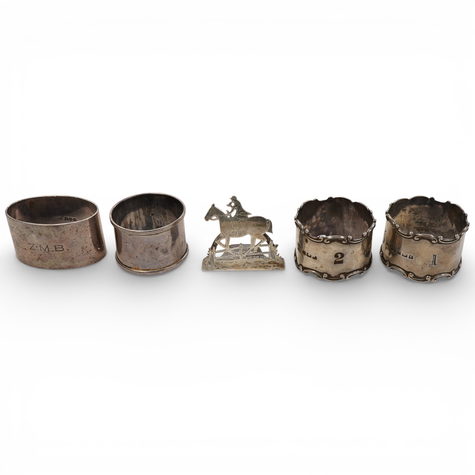 A late George VI silver menu holder, modelled as a fox hunting horse and rider, Adie Brothers, Birmingham, 1951, height 44mm, together with four assorted silver napkin rings.