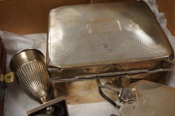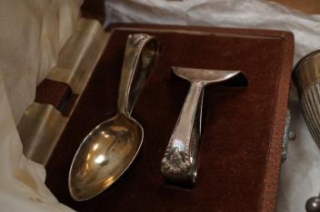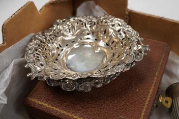 Lot 1841 , A late George VI silver three piece condiment set and two matching spoons, by Walker & Hall, Sheffield,1949/50, together with a pair of repousse silver bonbon dishes, three other silver condiments, a silver mounted cigar