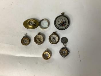 Lot 919 , A late Victorian 9ct mounted compass fob, hallmarked for Birmingham, 1900, together with an Edwardian silver mounted compass fob and five other base metal mounted compasses including a combination compass and loupe, 35mm