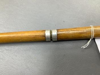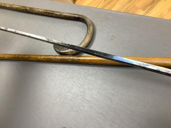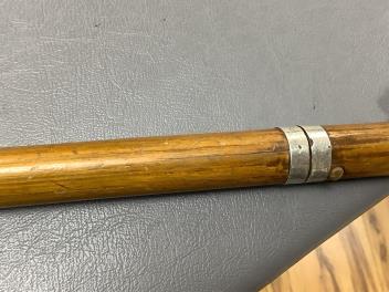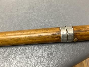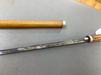 Swordstick 84.5cm overall including rubber ferule; blade 68.6cm; when sword is locked into it’s stick sheath, it can be pulled loose a little, the distance shown in image 6; spring button satisfactory. Two minor (old) cracks at silver-mounted joint of scabbard, images 7 and 8.