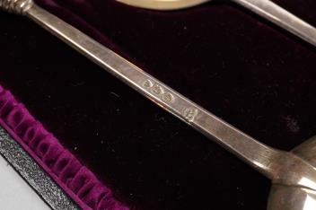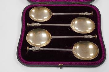 Lot 1840 , A late Victorian cased set of four silver apostle serving spoons, by Wakely & Wheeler, London, 1890, 19.6cm, 6.5oz.