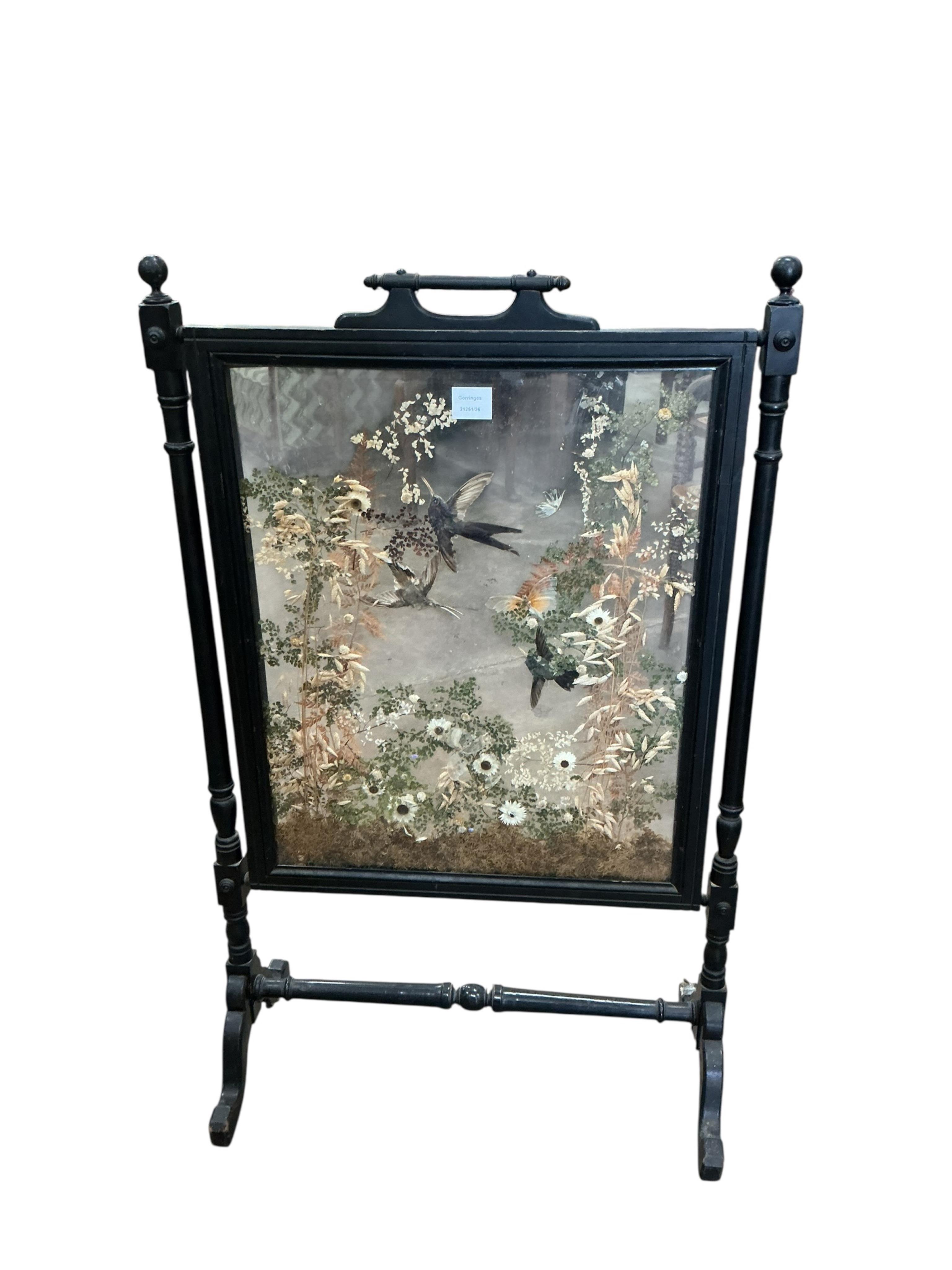 Lot 1098 , A late Victorian ebonised framed fire screen, the double sided glazed panel filled with humming birds, flowers and foliage, width 64cm, depth 30cm, height 103cm