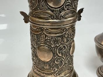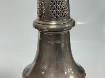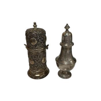 Lot 1844 , A late Victorian embosses silver lighthouse sugar caster, by Wakely & Wheeler, London, 1892, 17.2cm, together with a later George V silver sugar caster, James Dixon & Sons, Sheffield, 1933, 11.8oz.