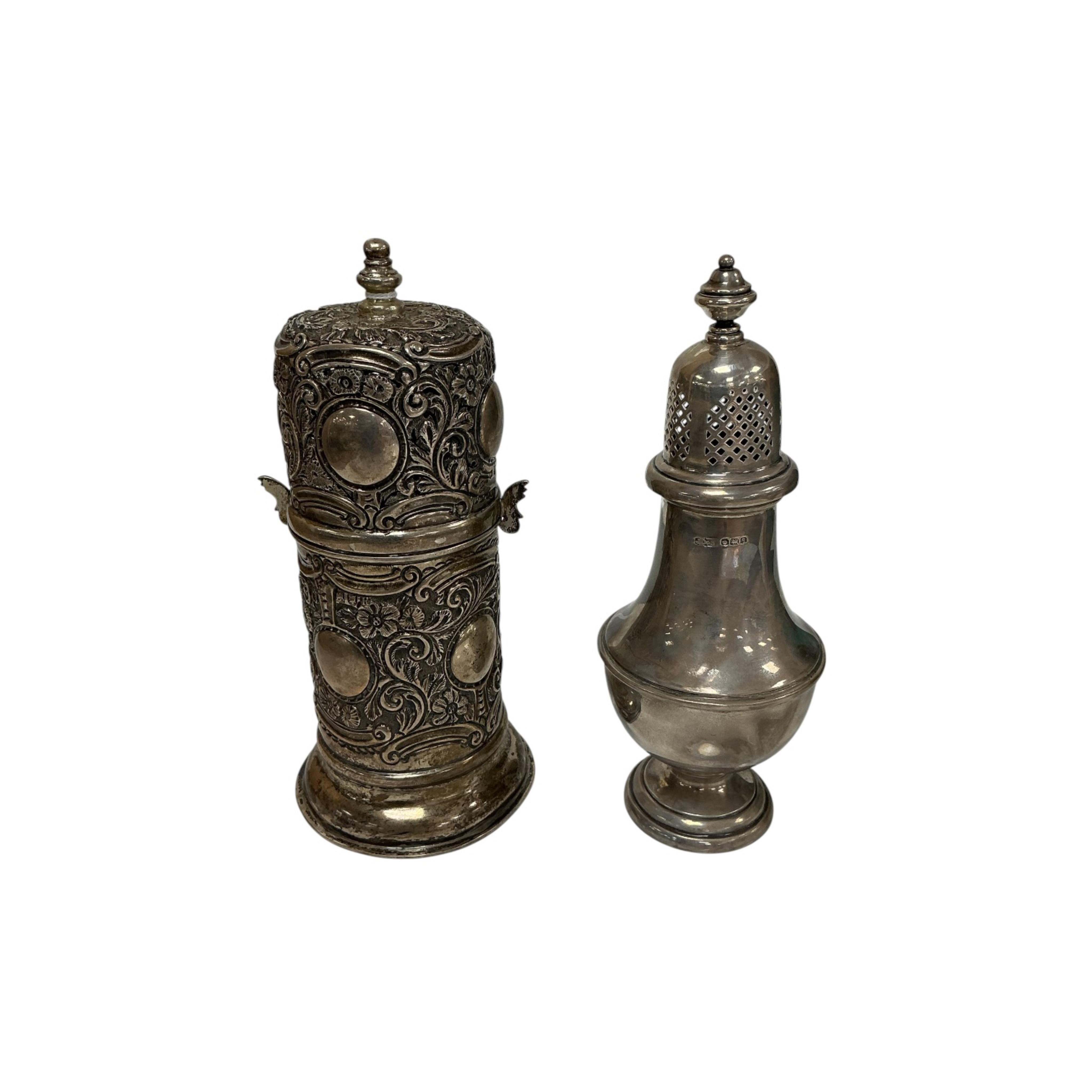 A late Victorian embosses silver lighthouse sugar caster, by Wakely & Wheeler, London, 1892, 17.2cm, together with a later George V silver sugar caster, James Dixon & Sons, Sheffield, 1933, 11.8oz.